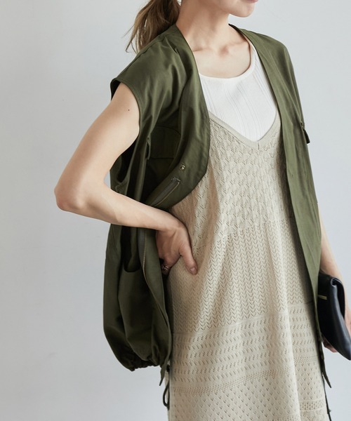 プラスワンで着こなしが様変わりする上級ベスト。 【デザイン・シルエット】 ・フロントに4つのポケットを設けたミリタリーベスト。 ・ウエストと裾はスピンドル付きのアジャスタブル仕様。 ・首もとのすっきりするVネックデザイン。 【カラー】 ・チャコールグレー、キャメル、カーキのシックな3色を展開。 【スタイリングポイント】 ・ウエストを絞れるため、スカート合わせもしやすい。 ・春先はフーディーに重ねたり、アウターのウエアから羽織っても素敵。 ----------------------------- 裏地:なし 透け感:なし 伸縮性:なし 生地感・厚さ:やや薄手 ポケット:あり 季節:春・秋 ----------------------------- ※撮影時の光、お使いのモニター環境によって色の見え方が違う場合がございます。 ※モデル身長:160cm 着用サイズ:38