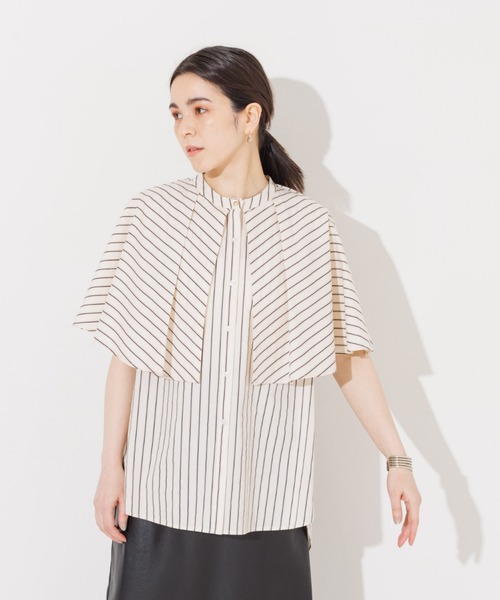 -Design-昨年も大人気だったケープのようなギャザー襟がついたボリュームカラーシャツを新しい素材でブラッシュアップ。 今回はストライプの柄も仲間入り。 襟のボリュームでNOMINEらしく他とはちょっと差別化できる存在感のある1枚。 -Detail- ハリ感がありしっかり見えする生地で、腕も隠れる仕様でスタイルアップ。 -Cordinate- インして着用するとギャザー襟とのバランスが抜群。 スラックスやひざ下丈のフェイクレザースカート等、縦のシルエットのボトムスと合わせるのがオススメ。