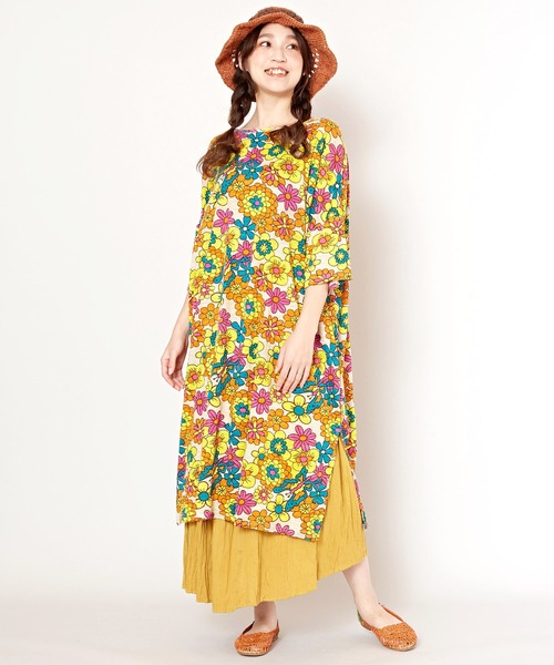 カラフルでレトロヒッピーな花柄が気分を上げてくれるTシャツワンピース☆★着心地の良いインド綿スラブジャージー素材を使用。 ゆったりとしたオーバーサイズとドルマンスリーブでサイズレスなシルエット。 両サイドスリット入りで、ワイドパンツやロングスカートなどのボトムと合わせやすく、カジュアルに着られます。 ※こちらの商品は1点1点職人による手作りとなります。その為、生地の取り方により柄の配置や形・色合いなど若干異なる場合がございます。(画像は一例です。)あらかじめご了承ください。 ※屋外での撮影画像は、光の当たり具合で色味・カラーが違って見える場合がございます。商品のカラーは、スタジオ撮影の画像をご参照ください。 Amina Collection Co.,LTD.