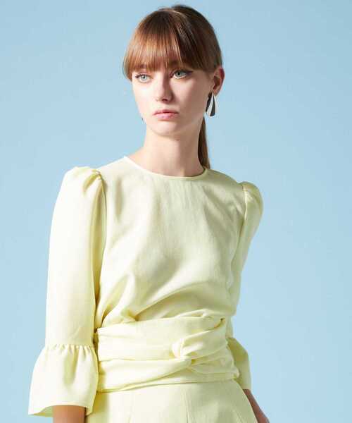袖口がベルのようになったブラウスです。 麻を思わせる肌離れの良いドライな素材でも、タッチは柔らかく品のある女性らしい雰囲気になっています。 肩幅が小さく華奢に見えるパフ袖になっています。 軽い素材感ですが、体のラインを拾いづらく涼しげなので、シーズン長く着て頂けます。 同素材のボトムスとのセットアップスタイルがおすすめです。 セットアップでの着用にはINできれいにきちんと着るのがポイントです。 カジュアルにも着られる素材なので、デイリーにデニムに合わせたりする時には、OUTで着ても決まるシャツカットのラウンド裾のデザインになっています。