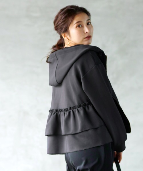 【手洗いできる♪】バックフリルティアードデザイン・ダンボールニットパーカー■ Emilyan オリジナル ■ぷりっとした中肉のハリのあるダンボールニットを総使いした、バックフリルティアードが華やかなデザインパーカーです。背中には大胆にフリルティアードをあしらい華やかなに仕立てました。綺麗めな印象なのでラフな通勤も休日も着まわせます♪手洗い可能でおうち洗い可能なのもうれしいポイントです♪ストレッチ性もあるため動きやすい1着です。ネック太めのグログランリボンをあしらったフード使い。フロントはゴールドのシングルジップです。お袖はドロップショルダーで袖幅に程よくゆとりのある長袖です。サイドには切り替えに沿ってポケットをあしらいました。ややコンパクトな丈でパンツにもスカートにも相性の良い1着です。<<お色展開 >>アイボリーベージュ / 淡い柔らかなお色チャコールグレー / ほんのり赤みがかった上品なチャコールグレーブラック / 定番のブラック<< サイズ選びについて >>こちらの商品は伸縮性がある為、S~Mサイズ寄りのLサイズのお客様にオススメのサイズ感です。===========================生地の厚さ:★★★☆☆ 透け感:なし裏地:なし伸縮性:あり光沢感:なし生地感 :しなやかなで程よいハリ感のある中肉生地お手入れ方法:手洗い可推奨着用シーズン:春・秋===========================【WhiteCollection】★商品のお気に入り登録 登録すると、完売しても再入荷時に通知を受け取ることができます。 ほかにもお得な特典があるかもしれません♪【ブランドのお気に入り登録】新商品や再入荷など、ブランドの情報をいち早くお知らせします。ぜひご登録ください◎※室外の光や照明の当たり具合で、実際の商品の色味とカラー別画像の色味に若干の違いが発生する場合がございます。※ご注文いただいた予約商品のお届け時期の確認は、注文履歴ページより行えます。
