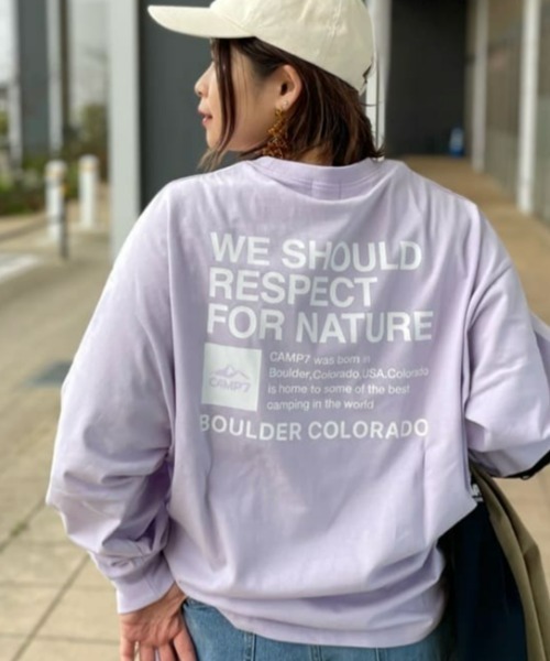 リサイクルコットンをMIXした太番手の糸を使用した、しっかりとしたロングTシャツです。【デザイン】プリントの色の組み合わせがおしゃれなロンT。バックプリントには自然に対してのメッセージが込められています。【スタイリング】1枚で着てもバックプリントが印象的なので様になりますし、フロントはシンプルなのでどんなアウターにも合わせやすいです。デニムパンツでカジュアルスタイルはもちろん、スカートと合わせてフェミニンな着こなしもおすすめです。同じバックプリントが施された色違いのメンズ用(品番:CP4401415204)、キッズ用(CP44032014)もございます。ご家族やカップルで、お揃いのコーディネートが楽しめます。【素材】肌に優しく着心地の良い綿100%。リサイクルコットン使用で環境にも優しい。抗菌防臭加工が施されているので、アウトドアや気温が上がってくるこの時期にぴったりです。■着用コメント(女性) 160㎝/Mサイズバックロゴが存在感抜群!160cmMサイズ着用でお尻が隠れる着丈!抗菌防臭加工が施されているリサイクルコットン生地になってます!配色がシンプルでおしゃれ。色展開は3色になっており同デザインでキッズもメンズもありカラバリも様々でお揃いコーデが楽しめます。■着用コメント(女性) 163㎝/Mサイズシンプルなデザインですが、後ろ姿のロゴのバランスが可愛さを演出してくれます。 厚すぎず薄すぎない生地感で、レギュラーサイズ感なので幅広いボトムスコーデを楽しめます。オーバーオールなどのインナーにも最適です!■着用コメント(女性) 156㎝/Mサイズ全体的に大きめで腕周りのゆとりがあり着痩せ効果大のアイテムです。淡いパープルの生地に白のロゴが映えてとても可愛いデザインになっております。スカートと共に合わせて甘めコーデにしてもおすすめですよ。《 CAMP7/キャンプセブン 》1971年アメリカ・コロラド州ボルダーで設立された老舗アウトドアブランド。ロッキー山脈にアタックするクライマー達のためのプロダクトを生み出していました。現在はその資産を活用し、アウトドアテイストをタウンウエアに落とし込んだカジュアルウエアを展開しています。ーーーーーーーーーーーーーーーーーーーーーーーーーーーーお得に&便利にお買い物を楽しむポイント♪▶商品のお気に入り登録(♥ハートマークをクリック)お気に入りアイテムの完売カラーの再入荷通知や、ラスト1点の通知、セールなどの情報をいち早くお届け。▶ショップ・ブランドのお気に入り登録新商品や再入荷、クーポン配布などお得な情報を随時お届け。ーーーーーーーーーーーーーーーーーーーーーーーーーーーー