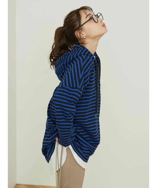 ボーダー柄がアクセントに映えるフード付きチュニック。 ゆったりとしたオーバーシルエットで、華奢な印象に見せてくれるのも嬉しいポイント。綿100%素材の優しい肌触りで着心地も快適です。 カジュアルコーデのポイント使いにも重宝しそうな1着。 透け感[無し] 裏地[無し] 伸縮性[有り] 光沢感[無し] 生地の厚さ[普通] 付属品[無し] ポケット[無し] ●製品寸法: L:バスト71cm 着丈[前]68cm[後]75cm 袖丈39cm 肩幅72cm 裾幅73cm 備考: