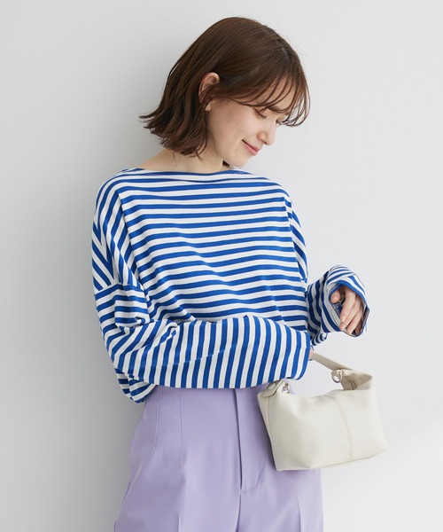 ボーダー柄がスタイリングにカジュアルなムードを漂わせるロンTEE。肩落ちのゆったりとしたドロップショルダーで、ルーズ感のあるシルエットに仕上がります。ゆとりのあるラウンドネックが首元をすっきりと見せてくれるのも魅力◎シンプルなボトムスと合わせたコーディネートがおすすめです。透け感[無し]裏地[無し]伸縮性[有り]光沢感[無し]生地の厚さ[薄手]付属品[無し]ポケット[無し]●製品寸法:F:バスト64 着丈67 袖丈43.5 肩幅67 裾幅64備考: