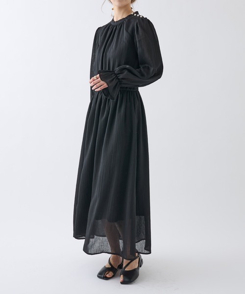 【首元のパールデザインが華やかなプリーツワンピース】シアー素材にプリーツが施された女性らしい上品な印象のAラインシルエットのワンピース。首元にあしらったパールがお顔周りを華やかにしてくれます。軽やかなシアー素材と程よいフィット感で、ボディラインの華奢見え効果も◎。きれい見えしつつ、ウエスト部分はゴム仕様で着心地楽ちん!スカートとボディ部分には裏地が付いているのでペチコート要らずで着用していただけます。【商品ポイント】・軽やかなシアー素材・シンプルながらも、首元のパールがポイントに・オケージョンシーンにぴったりの1枚・キャンディスリーブがコーデのアクセントに・身体の縦ラインを綺麗に見せてくれるプリーツデザイン・Aラインシルエットのワンピース【オケージョンシリーズ】・CWA1031109A0002 レイヤードワンピース・CWA1031109A0003 レースカーデ+キャミワンピースセット・CWA1031109A0004 肩パールプリーツワンピース----------------------------------------------------■商品特徴洗濯方法:家庭洗濯不可(ドライクリーニング)裏地:あり透け感:袖部分のみあり伸縮性:なし光沢感:なし生地の厚さ:普通----------------------------------------------------■素材表地:ポリエステル100%, 裏地:ポリエステル100%----------------------------------------------------※着用、お取り扱いの際は、商品についている品質表示とアテンションタグを必ずご確認下さい。※商品タグに記載されている商品名がWEBでの表記名と異なる場合があります。※実際の商品と仕様、加工、サイズが若干異なる場合がございます。※照明の関係により、実際よりもやや明るく見える場合がございます。またパソコンなどの環境により、若干製品と画像のカラーが異なる場合もございます。予めご了承くださいませ。【お気に入り登録】してお得な情報をCHECK!!・「商品のお気に入り登録」で再入荷通知や、ラストの通知、セール通知も受け取ることができます。・「ブランドのお気に入り登録」で新商品や再入荷など、お得な情報を受け取ることができます。