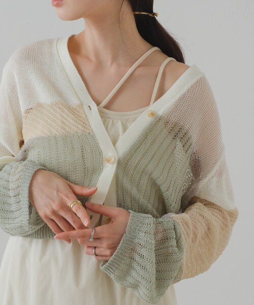 【2023SSカタログ掲載アイテム】配色がポイントのカーディガンが登場■デザイン ランダムな配色が目を惹くカーディガンが登場しました。透かし編みニットなので程よく透け感が出るデザイン。シンプルなボトムに合わせるだで、コーディネートが一気に華やかになります。丈感はスッキリと着ていただけるので、ボリューム感のあるボトムともバランス良く合わせて頂けます。■コーディネート Vあきデザインなので、アメスリ型やV紐デザインなどのインナーで変化を付けて頂くと印象が変わります。カーディガンのカラーと合わせたインナーを着て頂くとコーディネートがまとまるのでおすすめ。前を閉じてプルオーバーとして着ても、サラッと羽織るのも◎短丈なのでデニムはもちろん、カーゴパンツやロングスカートも相性抜群です。■初回店頭入荷時期4月上旬頃予定※入荷日ごとに数量が決まっている為、オンラインでは完売後に次期納期の数量にて予約販売を行っております。店頭入荷時期と予約商品のお届け時期が異なる場合がございますので、予めご了承下さい。※詳しい入荷時期に関してはお近くの店舗へお問い合わせ下さい。※こちらに記載している入荷時期は初回入荷時期となり、追加入荷のある商品もありますため詳しくお近くの店舗へお問い合わせ下さい。※サイズ採寸は各モールによって異なり、多少の誤差が生じる可能性がありますのでご了承ください。※商品画像はサンプル品を使用しているため、実際の商品と仕様、加工、サイズが若干異なる場合がございます。また、可能な限り実物に近いカラーにて掲載していますが、使用しているパソコンのモニター設定や、携帯電話のメーカー・機種により実際のカラーと異なって見える場合がございます。予めご了承ください。▼商品のお気に入り登録完売カラーの再入荷通知を受け取ることができます。▼PALCLOSETアプリにてブランドフォロー新商品や再入荷等、いち早くブランドのお得な情報を受け取ることができます。<返品・キャンセルについて>・着用・洗濯後の返品は致しかねます。・商品到着後、着用前に商品を確認して頂きますようお願い致します。kastane230204