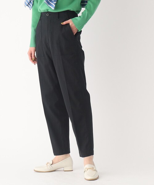 【My style is...掲載】本格的な素材の表情と、こだわりのシルエットが魅力のべイカーパンツ。【デザイン】・カジュアルにもキレイ目にもこなせる、キレイなラインのテーパードシルエット。・センタープレスを入れ、スラックスのようなキレイなシルエットを強調しています。・しっかりストレッチも効いているので、テーパードでもはきやすさ◎。・カジュアルにTシャツやスウェットを合わせてもキレイ目にまとまります。・クリーンなシャツやニットと併せてMIX感を出すスタイルもおすすめです。・ヒールやトラッドなシューズを合わせるだけで、「上品なカジュアル」の出来上がりです。※ポケット数:前×2 後ろ×2【素材】・オーガニックコットン(綿)を混紡し、ストレッチを効かせたオリジナルのバックサテン素材を使用しています。・通常、光沢のある面を表で使うサテン素材ですが、あえて裏面を表に使うことで、やや凹凸感があり表情のある素材感に。・程よい厚みを出すことでシーズンを問わず着用が可能で、より本格的な表情に。・カラダのラインを拾いにくく、キレイなシルエットが出るので、スタイルアップ効果の高い一本。・ストレッチも効いているので締め付け感もなく、動きやすさも〇です。※裏地なし※オフホワイト(003)はやや透け感があるため、インナーの着用をおすすめします。【カラー】ベイカーパンツでは定番のカーキ、黒に加え、ホワイトを加えてSSのムードを感じるカラー展開に。こちらの商品は主に春夏に着用いただける商品です。モデル情報:身長168cm B76 W58 H86 着用サイズ:38(M)店舗へのお問い合わせ商品番号:637-66010●製品寸法:34(SS):W60cm H82cm 股下67cm 前股上30cm 渡り幅28cm 裾幅16cm36(S):W63cm H84cm 股下68cm 前股上30cm 渡り幅29cm 裾幅16cm38(M):W66cm H86cm 股下69cm 前股上31cm 渡り幅30cm 裾幅17cm40(L):W69cm H89cm 股下70cm 前股上32cm 渡り幅31cm 裾幅18cm42(LL):W72cm H92cm 股下71cm 前股上32cm 渡り幅32cm 裾幅19cm備考: