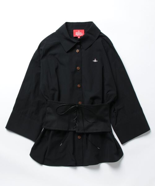 レースアップディテールの コルセットを取り入れたシャツブラウス。適度にゆとりのあるシャツにウエストをコルセットでシェイプし、身体のラインを綺麗に見せます。フェミニンなボトムや、あえてカジュアルなボトムとのスタイリングがオススメです。コルセットは簡単に着脱できるファスナー仕様なのがうれしい。クロ無地とブルーストライプの展開。