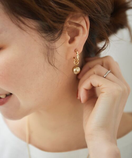 パールカラーが新鮮なフープイヤリング。 ブロンズカラーのコーティングとツイストデザインのフープの雰囲気がビンテージライクで、通常のパールとは一味違う印象に! 細かな揺れ感が女性らしく、フォーマルから通勤、日常まで幅広いスタイルにフィットしてくれます。