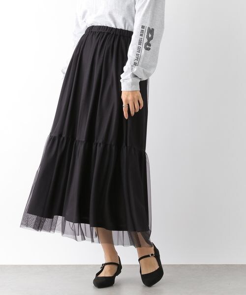 ーーー トレンドのチュールスカート ーーー 【デザイン】 フェミニンなチュール素材のスカートは今年のマストトレンド! 柔らかい素材ですが、広がりにくい絶妙なシルエットに仕上げました。 やや低めの位置に切り替えを入れて、すっきりとした上品な印象に。 【スタイリング 】 ニットと合わせてチュールの女性らしさを引き立てたコーデはもちろんのこと、 スウェットやカットソーでカジュアルに着崩すのもおすすめ。