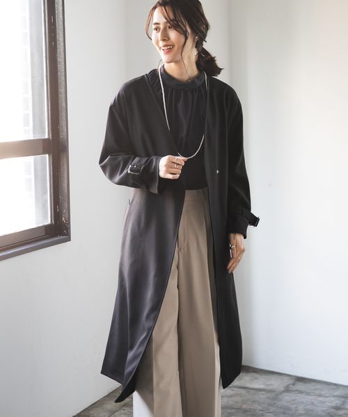 =NOBLE CHIC LINE= きちんと感と華やかさを両立 知的で上品な印象を与える一着 ーーー セレモニーシーンにもぴったり! 上品なノーカラーコート ーーー 【デザイン】 滑らかでパウダリーな肌触りがポイント。 防シワという点でもセレモニーにぴったりなアイテムです。 縦のラインを綺麗に見せてくれるノーカラーデザインで、顔回りもすっきり見えます。 付属のベルトを調整するとシルエットに変化をプラスできます◎ フロント部分にはスナップボタンがついているので、閉めてベルトを後ろで結ぶと、よりきれいめに着こなせます。