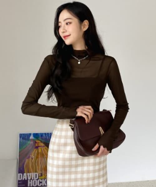 [COMMENT]シンプルで愛らしいタートルネックのブラウスです。首元は折り曲げて着用してもOK!透け感のある生地が色っぽく首と裾はウェーブでポイントをくわえました。一枚で着るならインナーは必須。ニットやスウェットとレイヤードしても可愛いです?→ブラックグレー/ダークベージュのご購入はこちら← ※スキントーンの下着とお召しいただくと安心です。