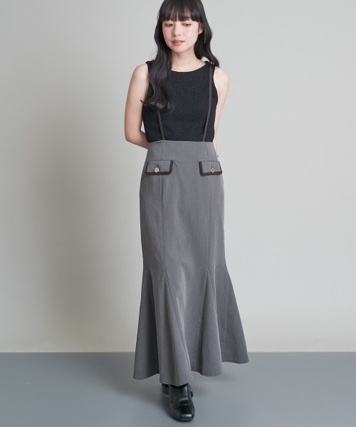 ◆マーメイドシルエットがきれい!◆ 綺麗なマーメイドシルエットで、膝位置が高めで足が長く見えるデザインです。 紐やポケット周りに配色パイピングがアクセントになっていて、 後ろ結びで長さ調整もでき、後ろで結んでも可愛く着ていただけます。 肩紐は取り外し可能です。 後ろゴムで履きやすいのも嬉しいポイント! A1JGS10とセットアップ着用可 …………………… 透け感:なし 厚さ:普通 伸縮性:なし洗濯方法:家庭洗濯可 …………………… ≪お気に入り登録機能の使い方≫ ■商品のお気に入り登録(ハートマークをクリック) 再入荷通知や値下げ等、お得なご案内を受けることができます。