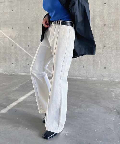 ーーー 定番のフロントラインデニムがSSに向けてリニューアル 本格的なデニムの風合いはそのままに紡績工場で廃棄されていた、 綿の落ちわたを集めて再利用し、環境に優しいリサイクルコットンを横糸にするサステナデニムを使用しました。 ポケット口から裾にかけてのセンター切り替えが足を長くほっそリと見せます。 後ろベルト下をヨーク切り替えに変え、ウエストからヒップにかけてをよりスッキリとしたシルエットになるようにしました。 履きこみの深いハイウエストと程よいフレアシルエットは、トレンド感のあるシルエットです。 新色のオフはカス残しにしているのでカジュアルな雰囲気でありながらクリアなオフカラーが春気分を一層高めてくれるアイテムです。 ーーー 〈注意事項〉 ・サンプルにて撮影をしておりますので、実際の商品とは素材や仕様・加工・サイズ等が若干異なる場合がございます。 ・モニター・環境等により実際の商品と色味が多少異なって表示される場合がございます。予めご了承をお願いいたします。 ・撮影環境により、光の当たり具合で色味が違って見える場合があります。あらかじめご了承下さい。 ・同商品でも、生産の過程で1~2cmの個体差が生じる場合があります。