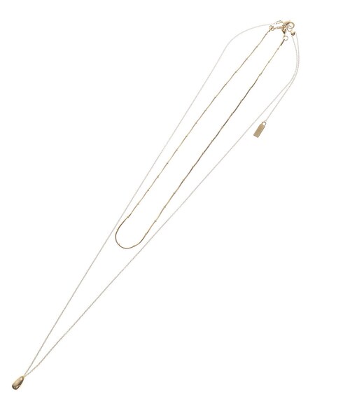 【デザインポイント】繊細なドットが入ったスネイクチェーンとドロップトップがセットになったネックレスです。スネイクチェーンは小さなアクセントドットが施された繊細だけど上品さがあるデザイン、シンプルなニュアンストップのロングネックレスとセットでつけるだけでこなれたレイヤードスタイルが完成します。1本ずつ単品でも使えます。【スタイリングポイント】セミフォーマルなシーンからデイリーまで馴染むアイテムです。ジャケットINやキレイ目ブラウスはもちろん、カジュアルなTシャツにも合わせるだけでこなれ感を演出します。店舗へのお問い合わせ商品番号:127-06203●製品寸法:00(FREE):全長75cm モチーフH1.2cm W0.6cm 付属袋H12.5cm 付属袋W11cm備考: