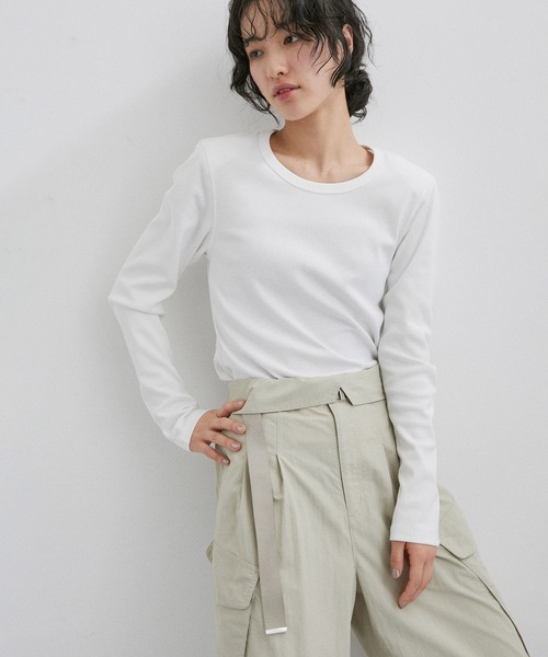 どんなときにも頼れる一着。身体に沿う立体パターンと主張しすぎない肩パッドが、全体バランスを整えてくれる大人のカットソー◇2023春夏◇ ADAM ET ROPE' FEMME 【Material】 きれいな表面感と適度な張り感のあるCOTTON USAがミックスされたリブ素材。 ※COTTON USAとは:環境に配慮した地球にやさしいコットン。サステナブル(持続可能)な農法により、公正な労働環境のもとで綿花を栽培しており、ハイテク農法により資源を最適利用。97%は代々受け継がれる家族経営農場。 【Design】 一般的には平面のパターンが多いカットソーを、身体に沿うように立体パターンで仕上げ、着心地の良さを際立たせたロングスリーブTシャツ。肩パッドを付けることで、かっちりとした雰囲気とリラックス感を併せ持った、汎用性のあるデザインが魅力。肩パッドを薄手にすることで、モードになりすぎずにチャレンジしやすいデザインに仕上げている点や、襟ぐりがきれいに見えるような開きにこだわった一着。 【Color】 スタイリングに取り入れやすい、ブラックとオフホワイトの2色展開。 【Styling point】 シンプルにデニムにインして、ネックレスやアクセサリーでポイントを付けて着用するのが素敵なのでぜひ。ジャンパースカートのインナーや、ジャケットのインナーとしてもおすすめ。 --------------- 裏地:なし 光沢感:なし 透け感:なし(ブラック) 透け感:ややあり(オフホワイト) ポケット:なし 伸縮性:あり 生地の厚さ:やや薄手 洗濯方法:手洗い可 その他仕様:肩パッド付 --------------- ◇モデル情報 (ブラック)身長:165cm size:F (オフホワイト)身長:167cm size:F