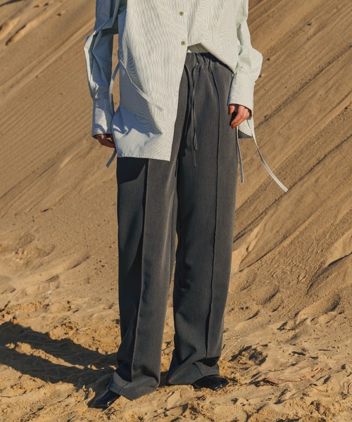 -point- & -styling- とろみ素材と上品なシルエットが魅力のセンタープレススラックス。 程よい太さのストレートパンツで美脚効果抜群です◎ シワになりにくく、落ち感のある生地でキレイ目な雰囲気ながら、 ウエストはイージー仕様なので幅広い体型の方に対応。 きちんと感とリラックスが両立したこだわりのイージースラックスです。 さらっとした生地なのでシーズンレスに着用できます。 両サイドにポケットがついている機能性も嬉しいポイント! ローファー、ヒール、サンダル、ブーツと、スニーカー等 シューズ合わせに困らない使いやすい太さのスラックス。 カジュアルすぎない明るめベージュ、トレンド感のあるグレー、 万能に使える定番ブラックの3色展開。 トップスをインでもアウトしてもこなれて見える絶妙シルエットに仕上げています◎ ---------------------------- 素材 ポリエステル78%・綿15%・ポリウレタン7% ---------------------------- 伸縮性 なし 生地の厚さ ★★★☆☆ 裏地 なし ---------------------------- ※170cmモデル着用画像はモデルの身長に合わせたサンプルです。 実際の商品採寸情報はサイズ表をご確認ください。 ---------------------------- ※モニター・環境等により実際の商品と多少色味が異なって表示される場合がございます。 予めご了承をお願いいたします。 ======================= ■袋梱包の為、染料による特有の匂いが抜けきれず、匂いがする場合がございますが不良品にはあたりません。 上記注意点での返品、交換はお断りします。ご了承の上お買い求めくださいませ。 ■本製品は生産過程におきまして色味、サイズ感等若干の誤差が出る場合がございます。予めご了承くださいませ。 ======================= 【お買いものをお楽しみいただく為に!】 ▼商品のお気に入り登録 完売カラーの再入荷通知や、ラスト1点の通知、セールの通知も受け取ることができます。 ▼ブランドのお気に入り登録 新商品や再入荷など、いち早くブランドのお得な情報を受け取ることができます! ルーズシルエット美脚イージースラックス