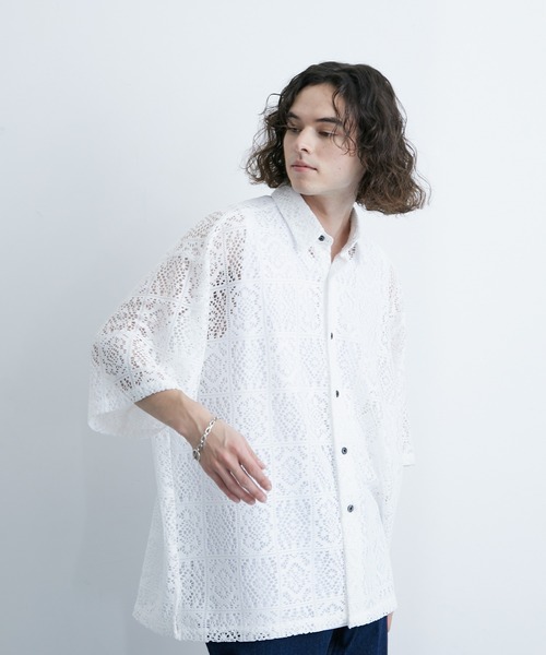 【 UNISEX、トレンドシルエット 】レギュラーカラーS/Sレースビッグシャツ ■素材、機能 今年トレンドのレース地を使用したオリジナリティ感のあるこだわりの素材です。 ■シルエット、デザイン 大きめの肩幅と身幅でゆったりとしたシルエットがリラックスした印象の半袖シャツ。 レイヤード次第で表情が変化するレース地と、シンプルなデザインのバランスが秀逸なアイテムになっています。 ■カラー 定番のブラック、ホワイトに加えてスタイリングのポイントになるニュアンスブルーの3色展開。 ■スタイリング ワイドパンツで合わせるたっぷりしたスタイリングはもちろん、トレンドのストレートパンツでシルエットにメリハリを付けたコーディネートもおすすめです。 裏地:無し 透け感:あり 伸縮性:なし 生地感・厚さ:普通 ポケット:なし その他仕様:なし 【モデル着用サイズ】 MEN:身長175cm 着用サイズL ※撮影場所やライティング、お使いのモニター環境によって色の見え方が異なる場合がございます。 ※商品のカラーは詳細画像の色味をご参照ください。