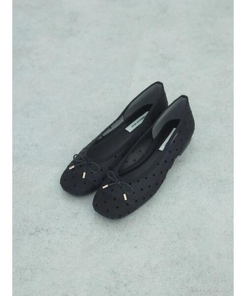 チュールドットで愛らしい印象に仕上げたフラットシューズ。 リボンのワンポイントも目を引くアクセントに。スクエアトゥで大人っぽい雰囲気を与えてくれます。 ほんのり肌の透ける素材使いが、足元に軽やかなヌケ感もプラス。 パンツやスカートなど、どんなボトムスとも合わせやすいアイテムです。 ●製品寸法: M:ソール23.5 ヒール1.3 幅7.9 L:ソール24.5 ヒール1.3 幅8.1 備考: