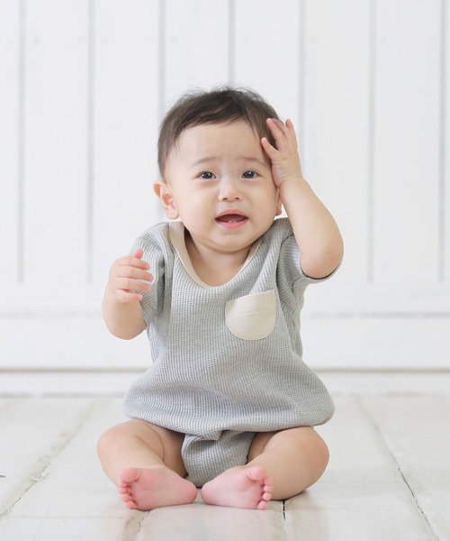 入園入学にむけて揃えておきたいベーシックなアイテムをご用意しました。 シンプルながらもディテールにこだわったシリーズです。□商品説明胸元の丸みバイカラーポケットがかわいい♪ベビー服に適したワッフル生地のロンパースです。ゆったりとしたかわいらしいシルエットでお出かけの日だけでなく、お家の中で過ごす日も快適に着用できます。4色展開で同シリーズのTシャツとの兄弟リンクコーデもおススメです♪