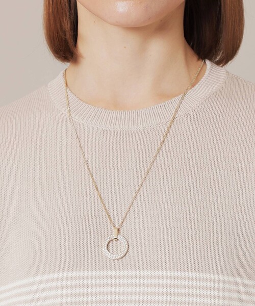 キュービックジルコニアをぎっしり埋め込んだリングモチーフのネックレスです。キュービックジルコニアとは、硬度が非常に高く、透明度にも優れ、屈折率が近い為ダイヤモンドに似た輝きを持つ人工石です。宝石と同じように1粒1粒爪止めをしており裏からも光が入る作りになっているので、カットガラスとは輝きが異なります。後方のカンで長さを2段階に調節することが可能です。ニッケルフリーのメッキを施しています。