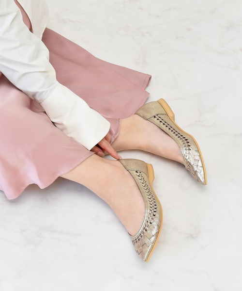 【Bridget Birkin/ブリジット バーキン】柔らかいラメ生地の編み込みデザインのフラットシューズ。エレガントなポインテッドでシンプルながら華やかな足元を演出します。カジュアルになりすぎずデイリーに履いていただけます。※生産過程に生じるキズが多少ある場合がございます。また素材の特性上、若干の色ムラ、擦れが見られる場合がございますが、こちらは素材の特性となります。予めご了承下さい。※輸送中に多少箱が破損する場合がございます。※サイズ換算(表記)はあくまで目安となります。