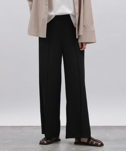ーーー クリーンなルックスながら、リラックス感もあるタックパンツ。 たっぷりとしたワイドシルエットがポイントです。 フロントのタックで、タテのラインを強調し、脚長効果も期待できます。 ウエストはゴム仕様なので、お腹回りもラクチンです。 【素材】 上品な落ち感があり、しなやかな表面のポリエステル×ポリウレタン素材。 サラッとなめらかな肌触りで、ノンストレスな着用感です。 シワになりにくく、お手入れもラクチン。 ーーー 【スタイリング】 ボリュームのあるワイドシルエットなので、コンパクトなトップスと好相性。 ワンピースやチュニックなどとレイヤードした、ルーズな着こなしもおすすめ。