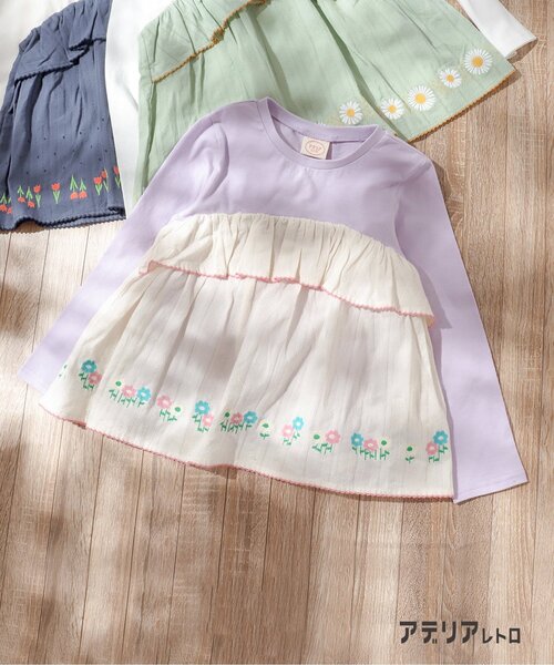【アデリアレトロ×アプレレクール】 なつかしくてあたらしい、大人気のアデリアレトロとアプレレクールのコラボレーションアイテムが登場♪ 前にフリルのついたボリュームのあるドッキングTシャツ。 裾部分にはアデリアレトロで人気の花ざかり、ラプソディー、コレックがそれぞれ刺繍で表現されています。 ストライプドビーという上品な生地を使用し、裾には配色の刺繍まで! アプレレクールの「かわいい」を詰め込んだイチオシのアイテムです◎ お揃いのカバーオールとぜひ合わせてチェックしてください。 【 apres les cours -アプレレクール- 】 「キオク いろどる、こどもふく。」 大切なキオクを彩る、お気に入りの一枚。 「アプレ レ クール」は独自の色づかいやテキスタイルで日々をトクベツに過ごせる そんな「一枚」をお届けします。