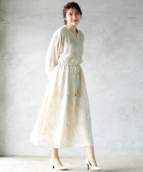 【手洗いできる♪】ウエストシャーリングリボン・マーブルプリントワンピース ■ Emilyanオリジナル商品 ■ 薄く滑らかな手触りの生地が心地よく、 流線形の模様が美しいマーブルプリントの エレガンスなワンピースです。 着心地が良く、シワにもなりにくい シャリ感のある生地で、 手洗い可能なのもうれしい♪ フワフワと軽い感触の生地なので 歩くたびにふわりと揺れるスカートが フェミニンな印象を与えます。 長袖の袖口には一部にゴムが使用され 着やすさも考えられており、 また、背中のタックや袖口のギャザーが 全体のシルエットを美しく魅せてくれます。 小顔効果のあるVネックや ウエストに入ったゴムと細いリボン等、 ゆったりとした着心地にもかかわらず スタイルアップを叶えてくれるデザインです。 この1着で特別な日の コーディネートが即完成です♪ 【 シルエット 】 ふわっとしたお袖、 たっぷりとゆれるスカート等 体の締め付けが少ない ゆったりとしたシルエットです。 【 カラー 】3色展開 ◆ベビーブルー×ダークブラウン (淡いベージュの地色にダークブラウンと淡いブルーのマーブル模様) ◆パープル×グレー (少しグレーがかった地色にグレーとパープルのマーブル模様) ◆イエロー×ブラウン (淡いイエローの地色にブラウンとイエローのマーブル模様) 【 オススメシーン 】 お呼ばれ・デート・女子会など 多様なシーンのコーディネートにおススメの1着です。 【 備考 】 フロントボタン開き。 手洗い可能。 =========================== 生地の厚さ:★☆☆☆☆ 透け感:若干あり 裏地:スカートのみあり 伸縮性:なし 光沢感:なし 生地感 :さらっとした手触り良い薄地の生地感 推奨着用シーズン:春・初夏 =========================== 【WhiteCollection】 大人の休日にマストな、 ヒトワザ効いたトレンドアイテムを提案。 デザインとプライスのバランスが魅力です。 【商品のお気に入り登録】 完売カラーの再入荷通知やラスト1点の通知、 プライスダウンの通知も受け取ることができます。 【ブランドのお気に入り登録】 新商品や再入荷など、 ブランドの情報をいち早くお知らせします。 ぜひご登録ください◎ ※室外の光や照明の当たり具合で、実際の商品の色味とカラー別画像の色味に若干の違いが発生する場合がございます。