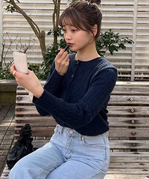 薄めの生地感のカーディガンです? 自然にからだにそうサイズ感ですっきりした印象を与えてくれまふ!ネックラインは無難なラウンドネックなのでどんな骨格の方もお似合いになると思います◎短めの丈感でコーディネートが組みやすい一着です! 着用カラー:ネイビー