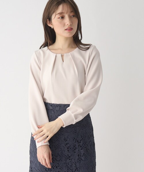 華やかな胸元がポイント!デザインリップルトップス 【素材】 ・やわらかでしわになりにくい着心地の良いリップル素材を使用。 ・適度な肉感なのでロングシーズン着用いただけます。 ※こちらの商品はやや透け感があるため、インナーの着用をおすすめします。 【デザイン】 ・胸元のパーツはさりげなくフェイクパールが並んだ華やかな一枚。 ・スリットネックのようになっているので縦のラインが強調されて顔まわりがすっきり見え。 ・セットインスリーブなのでジャケットのインナーとしてももたつかずすっきりと着用できます。 ・袖口にはタックをあしらいやわらかなシルエットに仕上げました。 ・袖口は別付けのカフスになっているので、袖をたくし上げたところでピタッと止まるのもうれしいポイント。 こちらの商品は主に春に着用いただける商品です。 モデル情報:身長163cm B81 W56 H82 着用サイズ:38(M) 店舗へのお問い合わせ商品番号:C58-16213 ●製品寸法: 36(S):着丈54cm B92cm 袖丈53cm 肩幅33cm 38(M):着丈55cm B94cm 袖丈53cm 肩幅34cm 40(L):着丈56cm B97cm 袖丈54cm 肩幅35cm 42(LL):着丈57cm B100cm 袖丈54cm 肩幅37cm 備考: