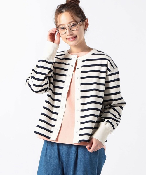 ベーシック 綿100%スナップ長袖カーディガン 季節の変わり目から夏のクーラーシーズンなど、オールシーズン使えるベーシックなリングドットボタンのカーディガンです。しっかりとした少し厚みのある100%綿を使い、こだわった素材チョイスとリングドット釦をデザインポイントにしたグランドパークらしいカーディガンです。 アウターのインに入れても映えるボーダーと、カジュアル通勤にも使えるムジ2色の色展開です。 ■point リングドットボタンはもちろん、袖口の長めのリブと表に入れたまたぎステッチがシンプルなカーディガンに味を加えています。 着用感はすっきり目のボディに少しボリュームを持たせた袖が付き、カジュアルな中にも女性らしさを出したシルエットです。 袖リブが太めでしっかり止まるので、袖を少しまくり上げて着用しても動きが出せます。 ■detail *着脱簡単でデザインポイントにもなるリングドットボタンを配置 *ポケットなし ■fabric …………………… 透け感:なし 裏地:なし 伸縮性:あり 光沢感:なし 生地の厚さ:やや厚みあり 洗濯方法:手洗い可能 …………………… ※詳しいお手入れ方法は商品タグをご参照ください ■coordinate *約60cmのスッキリした着丈なので、スカートでもパンツでもバランス良くコーディネート出来ます。 *メンズライクなベイカーパンツに合わせた大人カジュアルな合わせもおすすめです。
