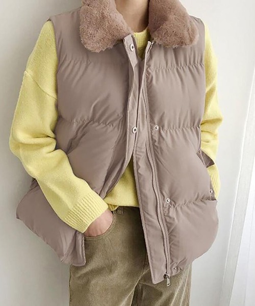 レイヤードを楽しめるイチオシアウター ■デザイン カジュアル、ガーリー、大人スタイルと相性のいいダウンベスト。 秋冬コーデとしていち早く取り入れられます★ インナーを変えて頂ければ長い期間着用可能◎ エコファー襟がアクセントに。 ■素材 軽くて楽な着心地。 さらっとはおれる素材感 ■スタイリング ワンピースやタートルネックの上から羽織ってきれいめに着たり、 ロンTやニット、バケットハットなどの小物と合わせてカジュアルに着て頂くのがおすすめ★ ボリュームのあるシルエットなので、ストレートパンツや、ショート丈のボトムと合わせるとバランスがとれて◎ さっと羽織れて長く着用して頂けます。