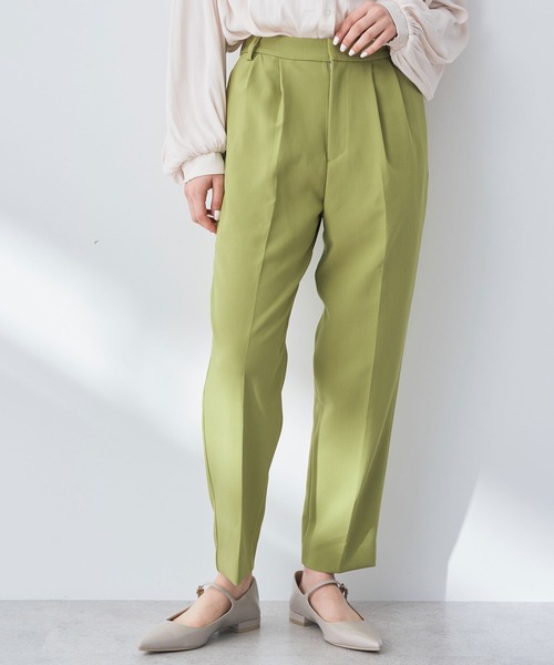 フロントに施されたタックが立体的なシルエットを生み出すパンツ。 裾に向かって細くなるテーパードシルエットで、下半身をすっきりと見せてくれます。 センタ―プレスが縦長感を強調し、スタイルアップ効果も◎ 様々なトップスに合わせやすく、幅広いコーディネートを楽しめるアイテムです。 透け感[無し] 裏地[無し] 伸縮性[やや有り] 光沢感[無し] 生地の厚さ[普通] 付属品[無し] ポケット[有り] 前2つ 後2つ ●製品寸法: S:ウエスト[後ゴム仕様]63cm ヒップ92cm 総丈91.8cm 股下63cm わたり周り31.5cm 裾幅16cm M:ウエスト[後ゴム仕様]68cm ヒップ96cm 総丈91.8cm 股下63cm わたり周り32.7cm 裾幅16.5cm 備考: