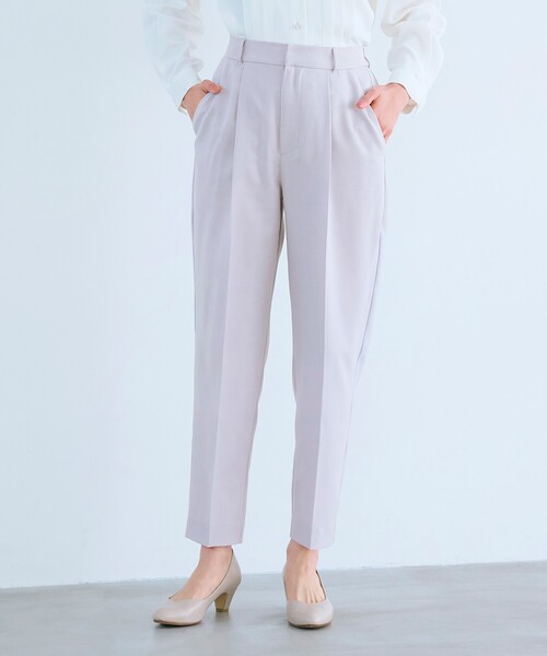 オフィススタイルにおすすめ!洗えてキレイ見えテーパードパンツ! 【デザイン】 ウエスト位置が高めの設定で脚長効果のあるセンタープレスのテーパードパンツ。 後ろにはゴムがはいっており、着用時にもウエストにリラクシー感があります。 ※ポケット数:横×2 後ろ×2 【素材】 麻調合繊のツイル生地を使用しており、マットな仕上がりで上品でシックにまとまります。 ご自宅でのお洗濯もでき、取扱いしやすい素材です。 ※768-46009とSETUP着用可能な商品です。 ※ネイビーカラーのみジャケットとパンツでカラー番号に相違がございますが、カラーはネイビーで同じお色になるのでセットアップとして着用可能でございます。 ※もも周りに裏地あり モデル情報:身長166cm B80 W59 H86 着用サイズ:02(M) 店舗へのお問い合わせ商品番号:768-66011 ●製品寸法: 01(S):W65~74cm H100cm 股下64cm 前股上26cm 02(M):W68~77cm H103cm 股下65cm 前股上26cm 03(L):W71~80cm H106cm 股下66cm 前股上26cm 04(LL):W74~83cm H109cm 股下67cm 前股上27cm 05(3L):W77~86cm H112cm 股下67cm 前股上27cm 備考: