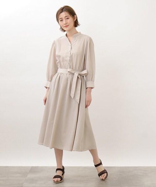 キレイ目&リラクシーが叶うフィット&フレアワンピース! 【デザイン】 スキッパーのシャツ風の上身頃でかっこよく見せ、スカート部分はたっぷりフレアな女性らしさを出したデザインです。 ウエストはゴム仕様で締め付けないデザインです。 ウエストには共布ベルトもついているので、リボンアクセントも素敵です。 ※ポケットなし 【素材】 風合いの柔らかいボイル素材にヴィンテージ加工を施した素材です。 ※スカート部分裏地あり ※こちらの商品の上身頃はやや透け感があるため、インナーの着用をおすすめします。 モデル情報:身長166cm B80 W59 H86 着用サイズ:02(M) 店舗へのお問い合わせ商品番号:768-56009 ●製品寸法: 01(S):着丈116cm B99cm 袖丈48cm 肩幅37cm W66~92cm 02(M):着丈118cm B102cm 袖丈49cm 肩幅38cm W69~95cm 03(L):着丈120cm B105cm 袖丈50cm 肩幅39cm W72~98cm 04(LL):着丈122cm B108cm 袖丈51cm 肩幅40cm W75~101cm 05(3L):着丈123cm B111cm 袖丈51cm 肩幅41cm W78~104cm 備考: