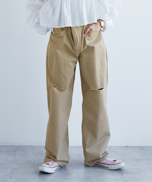 ダメージ入りのカジュアルチノ▼デザイン程よく抜け感がでる、ダメージ仕様のチノパンツが登場です。ウエスト調節できるのが嬉しいポイント。ベルトループを増やし、ボタンをひっかけることで調節可能なデザインに仕上げました。ウエストを絞ってもシルエットが綺麗になるようこだわった一枚。ベーシックなストレートシルエットに、程よいダメージ加工を施した今っぽいアイテムです。▼コーディネートベーシックなチノパンツなので、Tシャツやブラウスなど様々なアイテムと相性抜群。あえて腰履きにしてY2Kファッションにしても今年っぽく決まりおしゃれ見え間違いなし。さらに季節を問わず使えるデザインなのでオールシーズン着用できる万能アイテムです。--------------------裏地:なし透け感:なし厚さ:普通伸縮性:なし--------------------※商品の色は着用写真ではなく、商品写真をご参照ください。また、可能な限り実物に近いカラーにて掲載しておりますが、ご使用のパソコンおよび携帯電話の閲覧環境によっては、実際の色味と異なって見える場合がございます。予めご了承ください。※商品サンプルにて撮影しております。若干の仕様変更が生じる場合がございます。【お買いものにおすすめの便利機能!】★商品のお気に入り登録完売カラーの再入荷の時や、ラスト1点の時、セールになった時にお知らせします。★ブランドのお気に入り登録商品や再入荷、セール情報など、いち早くブランドのお得な情報を受け取ることができます。ぜひご活用ください!"