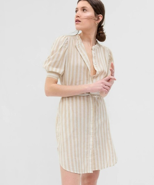 肌触り柔らかなコットンリネン混紡のシャツワンピース、ポケット付きバンドカラー五分袖パフスリーブ、袖口にボタン付きフロントボタン結ぶタイプのベルト付きフロントスラントポケットバックにシャーリングギャザー入り丸みのあるシャツテールの裾*商品タグに記載の価格とサイト上の販売価格が異なる事があります。【Gap ギャップ】1969年にアメリカ・サンフランシスコで創業以来、世界的なカジュアルファッションブランドとして、常にモダンなアメリカンカジュアルを提案し続けています。