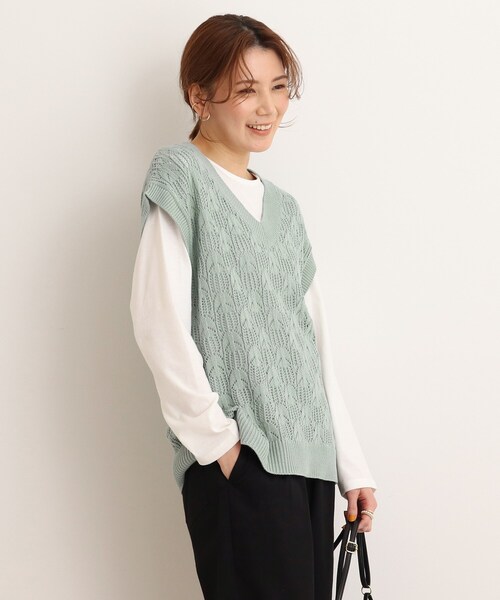 【デザイン】 透かし編みニットベストとロンTのセットアイテムです。 ベストは縦長の幾何柄をモチーフにした透かし編み柄ですっきり見え、VネックでTシャツ以外に、シャツやワンピースなどにも合わせやすくしています。 このセット一つでトレンドのレイヤードスタイルが完成します。 【スタイリング】 合わせやすい着丈なので、パンツスタイルにもスカートスタイルにも着こなしを楽しめます。 スキニーやテーパードシルエットのパンツと合わせると公園やテーマパーク等のアクティブスタイルにオススメ。 ワイドシルエットのボトムやフレアスカートと合わせてお花見やピクニック、カジュアルランチ会にちょうど良いコーデが完成します。 【素材】 ベストはざっくり感のある糸で編みたて、インナーは肌なじみの良いジャージ素材を使用しています。 ※こちらの商品のロンTはやや透け感があるため、インナーの着用をおすすめします。 ※こちらの商品のニットベストは網目が粗いため、お手持ちのインナー、セットアイテムのロンTを合わせて頂くのがお勧めです。 モデル情報:身長167cm B78 W62 H88 着用サイズ:02(M) 店舗へのお問い合わせ商品番号:C62-16324 ●製品寸法: 02(M):ベスト着丈60cm ベストB108cm ベスト肩幅50cm 長袖Tシャツ着丈60cm 長袖TシャツB102cm 長袖Tシャツ袖丈56cm 長袖Tシャツ肩幅41cm 03(L):ベスト着丈62cm ベストB112cm ベスト肩幅51cm 長袖Tシャツ着丈62cm 長袖TシャツB106cm 長袖Tシャツ袖丈57cm 長袖Tシャツ肩幅42cm 04(LL):ベスト着丈64cm ベストB116cm ベスト肩幅52cm 長袖Tシャツ着丈64cm 長袖TシャツB110cm 長袖Tシャツ袖丈58cm 長袖Tシャツ肩幅43cm 備考: