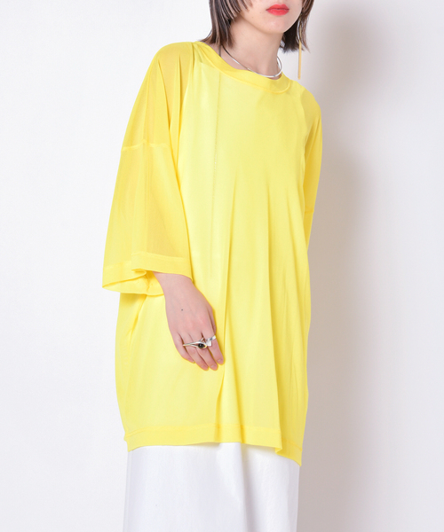【2023SS】CITYSHOPTULLE T-SHIRT / チュールTシャツ人気の「TULLE Tシャツ」が今シーズンも新色展開でリピート登場!CITYSHOPで人気のチュールカットソーの半袖タイプ。半袖Tシャツと合わせてもゆったりと着られるサイジングが魅力。こだわったソフトなチュールは、ネックと袖に切り替えを付けてTシャツのような表情に。家庭でも手洗いできるイージーケアもうれしいポイント。キャミソールやノースリーブのワンピースの上に着て、シアー感を出す着こなしもおすすめです。 **********************透け感:あり裏地:なし伸縮性:なし光沢感:なし生地の厚さ:薄い**********************【スタッフ着用コメント】《スタッフ》身長:153cm/普段サイズ:S/着用サイズ:フリーサイズ感:着丈はヒップが隠れる位、身幅は広めですが落ち感が出る感じ、袖の長さは肘が隠れる位でした。素材感:チュールですがしっかりした生地感です。着心地:サラサラと柔らかく、とても軽い着心地です。伸縮性は無いですが、BIGシルエットなので着脱もしやすかったです。**********************※取り扱いについては、商品についている品質表示でご確認ください。※照明の関係により、実際よりも色味が違って見える場合があります。またパソコン・スマートフォンなどの環境により、若干製品と画像のカラーが異なる場合もございます。※商品の色味は、商品アップ画像をご参照ください。本体:手洗い可能