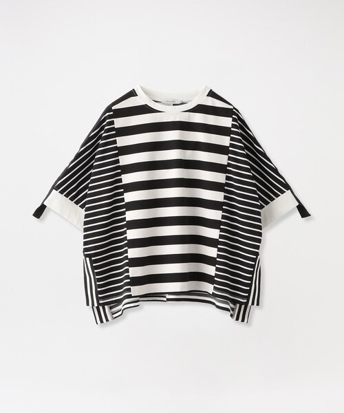 ゆったりとしたシルエットで、こなれた印象のボーダーコンビプルオーバー 【素材】 程よい厚みでゆったりとしたシルエットが出るポンチ素材を、クリーンなイメージのあるボーダー柄で編み立てました。 ご家庭で手洗いができる素材です。 【シルエット/デザイン】 ゆったり着用できるオーバーなサイジングで、華奢見え効果も狙える1着。 ピッチ違いのボーダーを組み合せることで、デザイン性を持たせました。 すそにはスリットが入っており、程よい抜け感を演出。 肩にはカラーテープを取り付けることで1着でも着映えするようアクセントを加えました。 【スタイリング】 サイドスリット仕様なので、きれいめパンツと合わせてフロントインしたコーデもおすすめです。