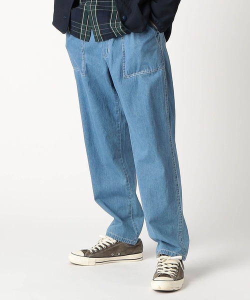 ライトオンスで軽く履きやすい夏までしっかり使えるデニム素材のイージーベイカーパンツ。 ・デザイン ライトオンスのデニムを使用してフロントのポケットと配色ステッチが特徴のベイカーパンツにしています。 軽めの素材感と、加工感を出さないで全体的に均一な色落ちにする事でデニムの武骨さをなくしています。 ウエストにはゴムとコードのイージーパンツ仕様でタックインなどのスタイリングにも対応できます。 ・シルエット ベイカーパンツならではのゆったりとしたシルエットをベースに膝から裾まで細くなっているテーパードにする事で全体をすっきりと見せています。 渡りの幅に合わせて股下を長くすることで全体を程に程よいボリューム感を出しています。 ・ファブリック 6.5オンスのライトデニムを使用しています。生地感も厚くなく、軽いので夏場での着用もできます。 ・スタイリング 同素材でのシャツブルゾンとセットアップでコーディネートもおすすめです。 Tシャツ、スウェットなどカジュアルアイテムに相性抜群です。 ※ご家庭でのお洗濯可能な商品です。詳細、取り扱い方法は商品に付いている品質表示、アテンションタグをを御確認下さい。 ***************** 裏地:なし 伸縮性:なし 光沢感:なし 生地の厚さ:普通 透け:なし ***************** <スタッフ着用コメント>本社 Hさん身長:178cm/体重:66kg/体型:普通/普段サイズ:48(L)/着用サイズ:48(L) サイズ感:ゆとりがあるが、裾がテーパードしているので太く感じない 素材感:軽めのデニムで、肌触りも良い 着心地:ウエストがゴムで、全体もゆったりしているので楽に履ける。