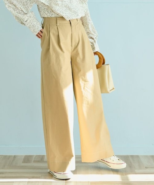 ミリタリーライクな風合いがトレンド感漂うワイドパンツ。 ベーシックなデザインに配色ステッチが目を惹き、スタイリングのアクセントになります。 股上深めのハイウエスト仕様で脚長効果があるのも嬉しいポイント。 ゆとりのあるワイドなシルエットにタックを施し、程よいボリューム感を出しつつも、 ウエストまわりのすっきり見えも叶えます。 トップスのイン/アウトどちらもきれいに見える美シルエット◎ デイリー使いしやすく、カジュアルにもきれいめにも着回せる万能アイテムです。 ベルトループ付きなのでお手持ちのベルトとのコーディネートも楽しめます。 大きめのポケットで実用性があるのも嬉しいポイント◎ 肌触り柔らかなコットン100%。 さらっとした触り心地でロングシーズン穿いていただけます。