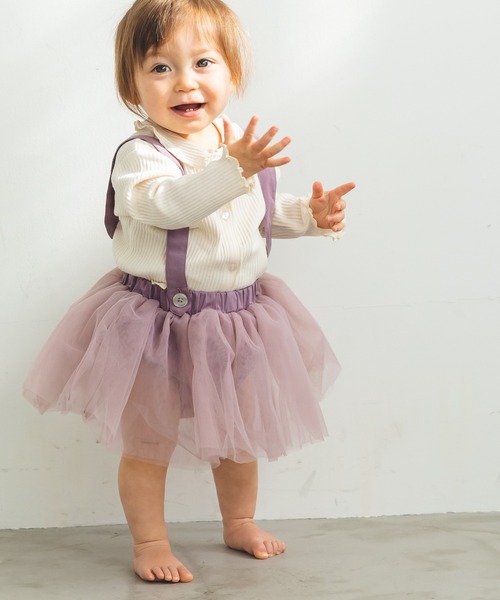 サスペンダー付きスカート風ふわふわチュールブルマが今季から仲間入りしました。 中はブルマなので見た目はスカートのように着ていただけます。ブルマとチュールスカートはウエスト部分でドッキングしているので、お子様が元気に動いても安心のデザインに。 サスペンダーは取り外しと2段階のサイズ調整が可能。サスペンダーをつけてシャツと合わせてコーデしたり、チュニックの下にチュールブルマだけで合わせたりとコーデの幅が広がるマルチなアイテムです。 生産時期により色味が若干異なる場合がございます。ご了承ください。 【濃色品・色落ち色移り】 濃色品は、色落ち・色移りをする恐れがあります。摩擦(特に湿った状態での摩擦)や汗や雨などで他の衣料や下着(特に白物)に色移りしますので、十分ご注意ください。 【ポケット】 なし 【伸縮性】 なし 【透け感】 あり 【裏地】 なし 【クリーニング】 洗濯機洗い可(ネット使用)