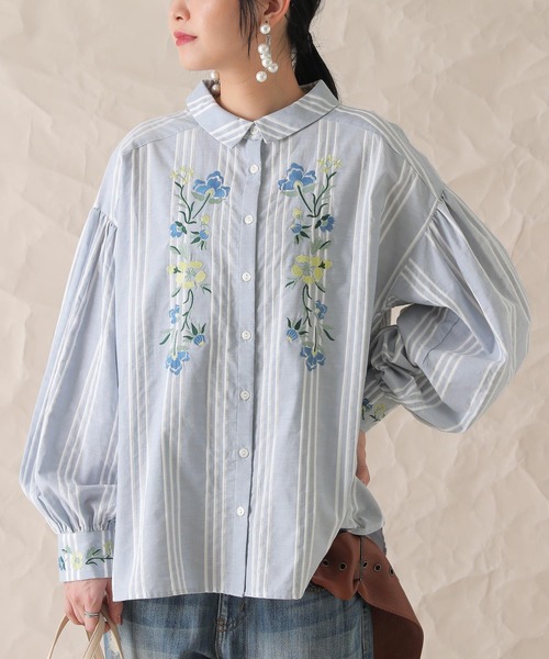 『上品な華やかさを纏う。』 ここにしかない花柄刺繍を施した、大人女子に似合うシャツブラウス♪ 肌触りの良いスラブ生地のコットン素材で、風合い漂うお洒落な印象に。身頃とカフスに施した、甘すぎないくすみ系カラーの花柄刺繍が繊細な上品さを感じさせてくれます。 たっぷりのギャザーで生み出した、ボリューム感のある袖のシルエットは、女性らしさ抜群。 特別感を醸し出す≪somari imagination≫花柄刺繍ボリューム袖シャツブラウスです。 【素材について】 パターン① 本体:(ホワイト)レーヨン52% コットン48% (サックスブルー)コットン100% 刺繍:ポリエステル100% パターン② 本体:(ホワイト、サックスブルー)コットン100% 刺繍:ポリエステル100% ※生産時期により➀➁のように混率が異なります。 素材はお選びいただけませんので、予めご了承ください。