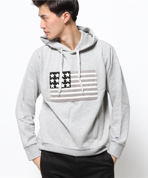 【RUSSELL】星条旗パーカー “スポーツブランド【RUSSELL】のベーシックなパーカアイテム◎” アメカジスポーツウェアをベースに展開している【RUSSELL】!! 大きく刺繍された星条旗モチーフがGOOD☆★ インナーに最適な1枚です♪♪