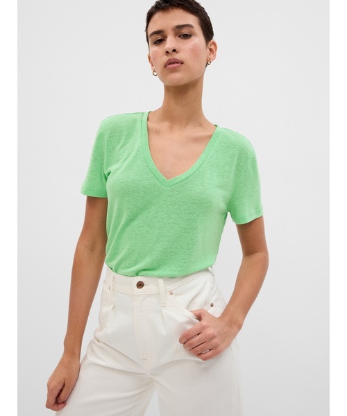 肌触り柔らかなリネン混紡生地で作られたTシャツやや透け感あり Vネックカットソー 半袖 *商品タグに記載の価格とサイト上の販売価格が異なる事があります。 【Gap ギャップ】1969年にアメリカ・サンフランシスコで創業以来、世界的なカジュアルファッションブランドとして、常にモダンなアメリカンカジュアルを提案し続けています。