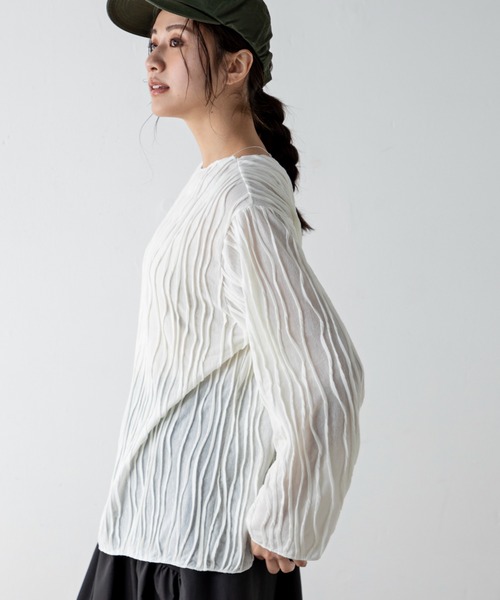 ◆ point 立体的なステッチデザインを施したシアートップス。やわらかな肌触りのカットソーで、程よい透け感で春らしい装いに。 ゆったりとしたサイズで楽に着られ、大人な抜け感を演出します。 ◆ fabric 伸縮性のあるカットソー 透け感:あり 厚さ:薄め 伸縮性:あり 裏地:なし ポケット:なし 洗濯方法:手洗い ◆ coordinate 立体的な生地の為一枚で着ても映え、ジャンスカ等に合わせたレイヤードスタイルにも程よい華やかさを加えます。 ◆ model size ■オフホワイト | MODEL(メイン画像):身長 172cm / B 83cm / W59cm / H87cm ■ブラック | MODEL(メイン画像):身長 172cm / B 83cm / W59cm / H87cm ■ベージュ | MODEL(メイン画像):身長 172cm / B 83cm / W59cm / H87cm ◆ staff voice 着映えとカジュアルを兼ね備えた優秀アイテムです!レイヤードしたときにコーディネートのアクセントになります。 #メローステッチ #シアー #着回し ≪お気に入り登録≫再入荷や、セール情報などお知らせを受け取ることができます! ≪Instagram:@millioncarats_official≫新作やセールなど最新情報をチェック!
