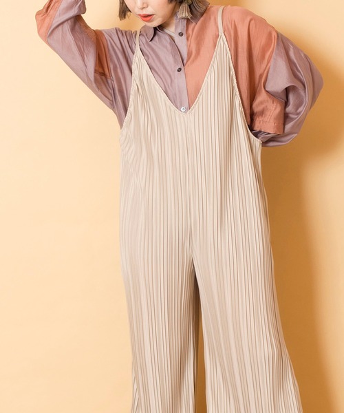 Spring Summer collection リラクシーな着心地ながら、リーンなシルエットが魅力のオールインワン。 透け感: ほぼなし(L.BEIGE) 伸縮性: あり(プリーツ分) 光沢感: ややあり 裏地: なし 素材について: ツヤがあり、上品な印象。 自宅で丈のカットが可能 【仕様】 肩ヒモ調節可 【洗濯表示】 洗濯機可 ■商品のお気に入り登録 クーポンやタイムセール、再入荷通知やラスト1点など お得な情報を受け取ることができます。 ご登録をお忘れなく◎