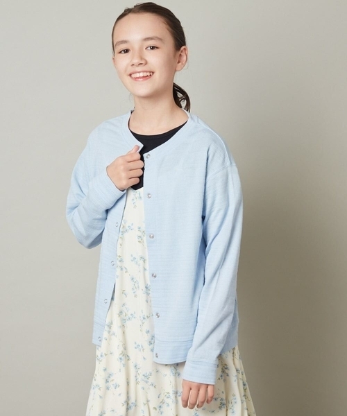 ◆上品カジュアルな印象の定番カーディガン◆ 【デザイン】 ・体温調整に便利なさっと羽織りやすいカットソーカーディガン。 ・きらっと光るシルバーのリングドットボタンがおしゃれ。 ・クルーネックデザインで首元がすっきりとした印象に。 【素材】 ・凹凸感のあるジャカード素材。 【スタイリングポイント】 ・シンプルなカーディガンは、きれいめにもカジュアルにも合わせやすい汎用性の高さがポイント。 ・程よい丈感で普段使いしやすく、通学にも便利◎ 【カラー】 ・ライトブルー…子ども人気の高い定番ライトブルー。 ・ラベンダー…上品で女の子らしくかわいいラベンダー。 ・ホワイト…爽やかな印象で、カラーアイテムとの相性抜群なホワイト。 -------------------- 透け感:なし 裏地:なし 伸縮性:あり 光沢感:なし 生地の厚さ:普通 -------------------- ≪お気に入り登録機能の使い方≫ ■商品のお気に入り登録(ハートマークをクリック) 再入荷通知や値下げ等、お得なご案内を受けることができます。 -------------------- ※WEB・一部店舗限定販売です。 ※同じデザインの140サイズ/150サイズ/160サイズございます。 140サイズ/150サイズ商品コード:KJCGT41029 160サイズ商品コード:KJCGU41034 ※サンプルでの撮影となるため、実際にお届けする商品と仕様やサイズが異なる場合がございます。 ※商品画像は、光の当たり具合やパソコンなどの閲覧環境により実際の色味と異なって見える場合がございます。 商品の色味の目安は商品単体の画像をご参照ください。